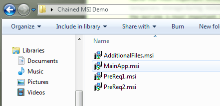 First make sure you have discovered all the files you plan to include in your chained MSI package. For this example I have renamed some MSI files generically so that it would serve the purpose of this instruction better.