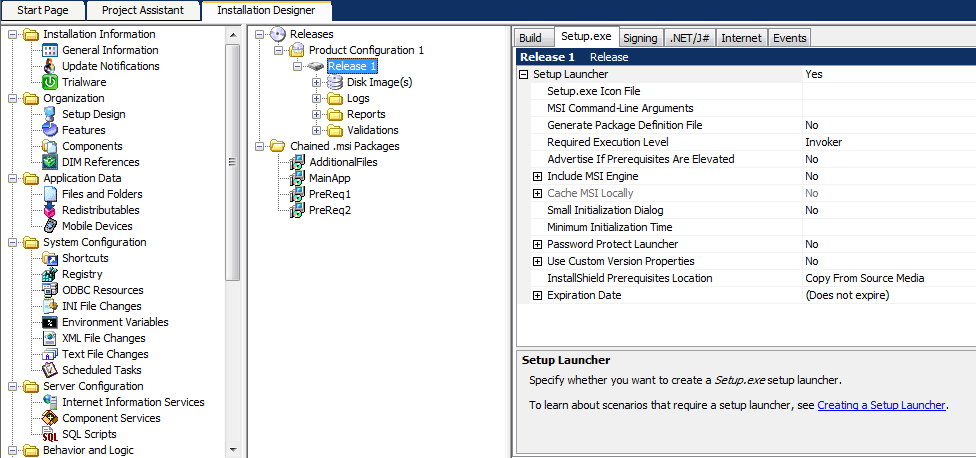 (To clean up your install files even more you can change the setting in your release to not include a setup.exe launcher. Since this is the sort of thing that we are trying to avoid using, and using one with a chained MSI is not reliable anyway this is an easy way to cut unwanted files.)
