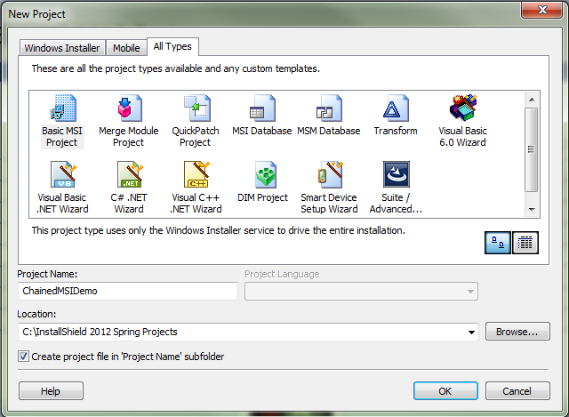Fill in the Project Name field with whatever you want to call your chained MSI