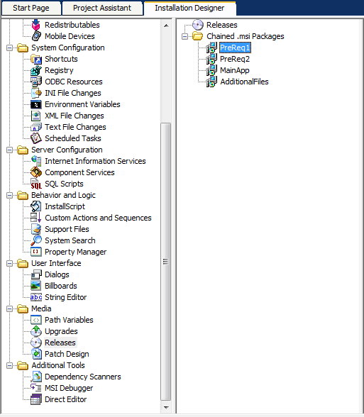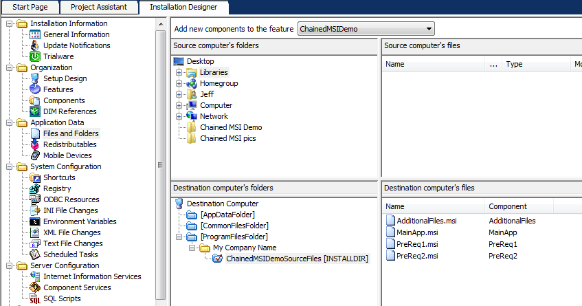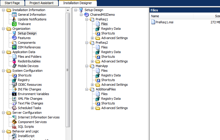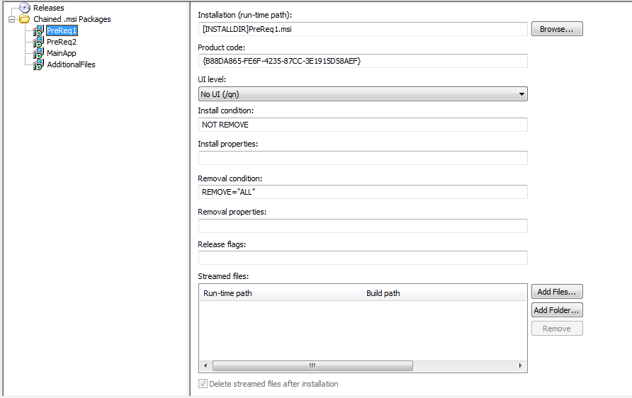 Also in the white paper by Flexera is an attempt to explain the options you can choose while creating your chained MSI package. The white paper’s recommended option is to “stream” your individual MSI files into the chained MSI. Now understandably this is the cleanest and most compact solution when creating your chained MSI, however, it’s also the most limited. Even the white paper itself explains the limitations of creating a streamed chained MSI packaged. Just to name the most important limitations: package size limit is 2GB; streamed media is placed in temporary storage during install and removed by default after installation is complete. For me the last one is most important. By not having the source media available on the local system after install repairs or individual packages would have to be pointed to a location where the original source files can be found. So that is why this post is about Non-Streamed Chained MSI packages. By not streaming the files directly into the chained MSI you allow for much more flexibility and easier long-term maintenance of the application after local installation.
